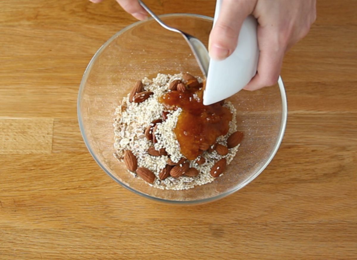 Das Samenöl und den Honig zu der Trockenmischung geben. Gründlich mischen, bis eine glatte Masse entsteht, wobei darauf zu achten ist, dass alle trockenen Zutaten gut bedeckt sind.
