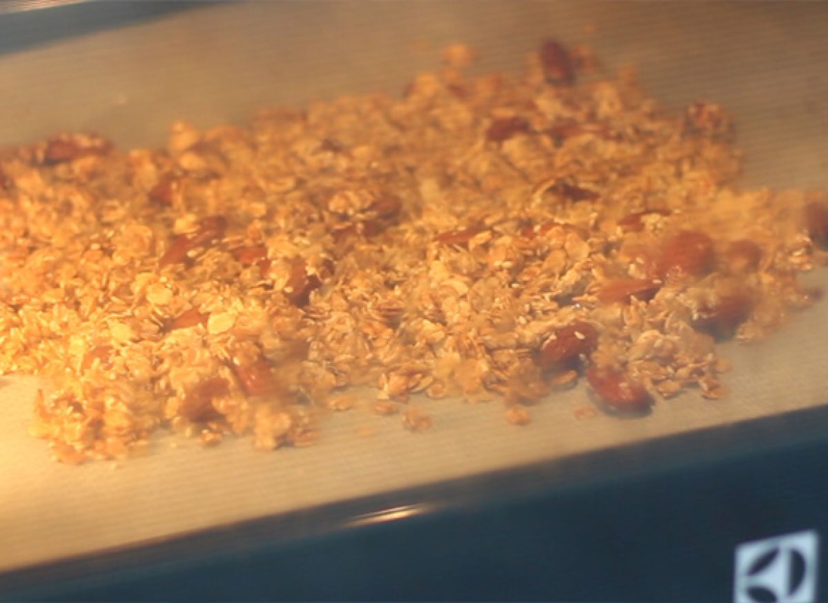 Den Backofen auf 180 °C vorheizen und die Form etwa 12 Minuten lang backen. Während des Backens ist es ratsam, das Müsli nach der Hälfte der Zeit umzurühren, damit es gleichmäßig braun wird.