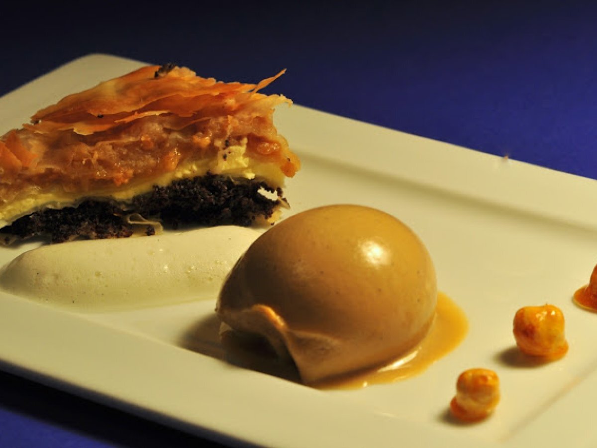 Apfel-mohn-haselnuss-kuchen, beschwipstes mokkaeis, gewürzschaum