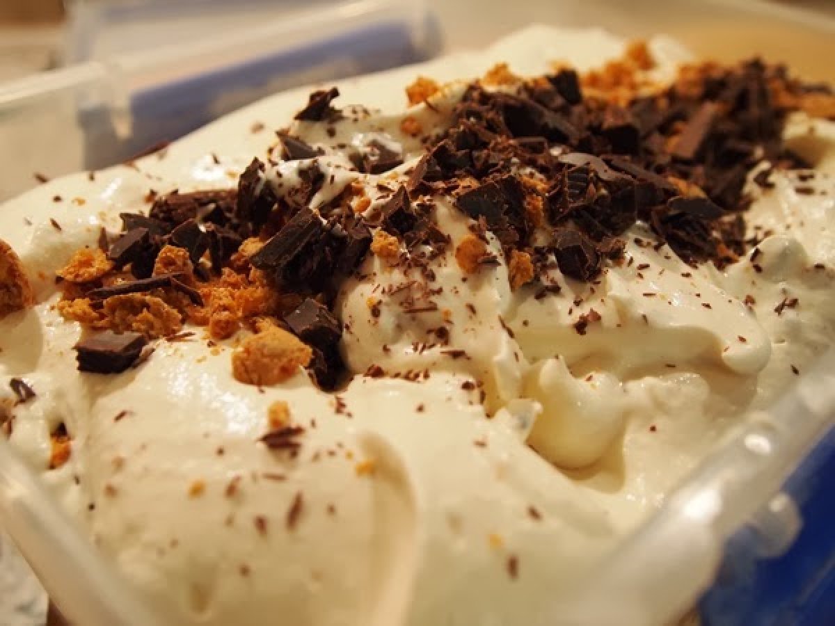 - Zutaten in die Maschine geben und zu einer weichen Creme aufschlagen. Aroma-Stoffe nach Wahl untermischen, bei mir waren es zerbröselte Amaretti Biscuits und gute dunkle Schokolade, denkbar sind auch verschieden Nüsse - vielleicht karamellisiert