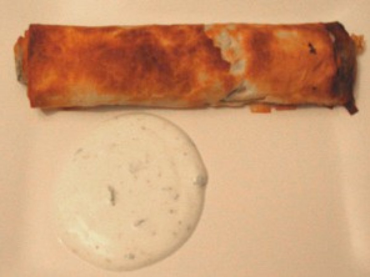 - 1/5 Spinat-Hack-Masse auf ein Ende verteilen, dabei an den Seiten einen kleinen Rand lassen.