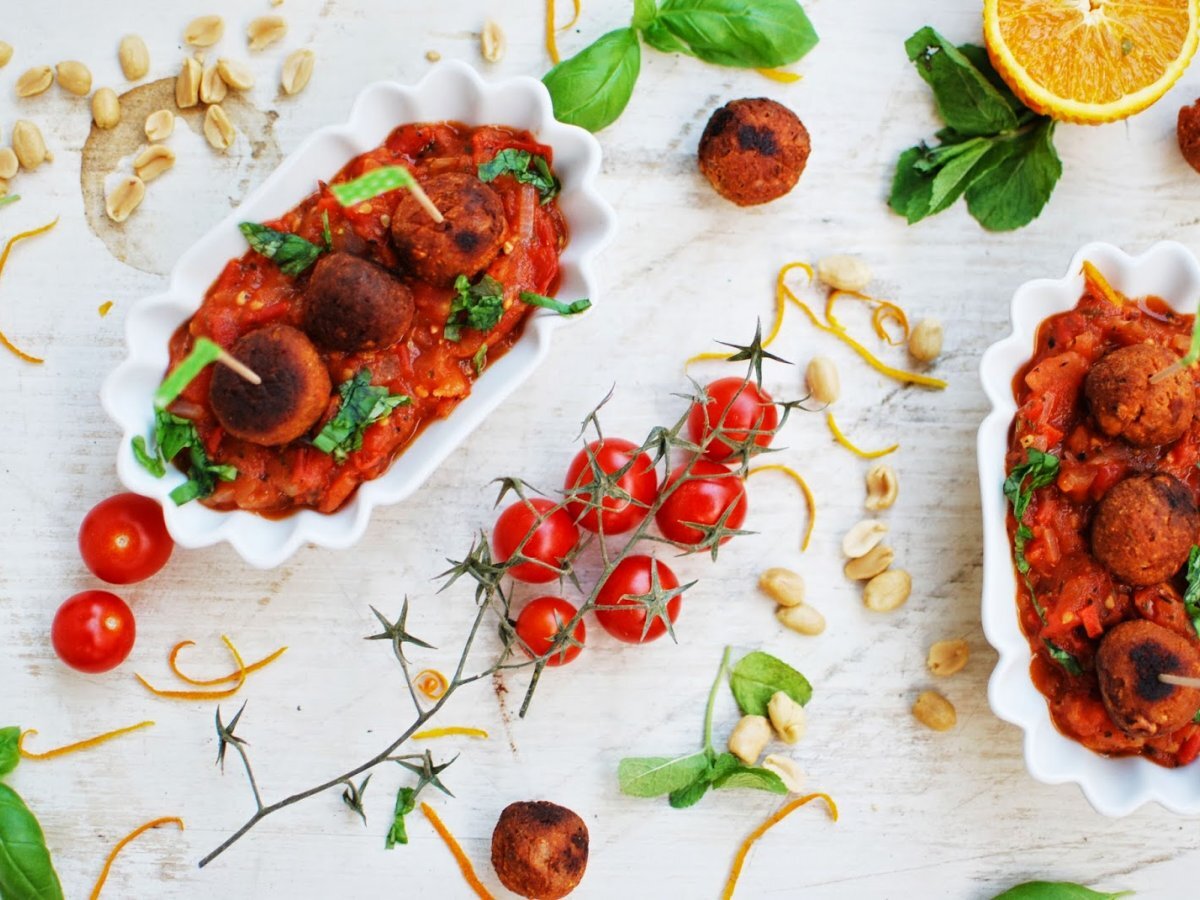 - In einer küchenmaschine nun die kichererbsen, tomatenmark, weißes mandelmus, shoyu, zitronensaft und -schale, minzblätter, ahornsirup und paprikapulver gut durchmixen, bis ihr einen feinen brei erhalten habt.