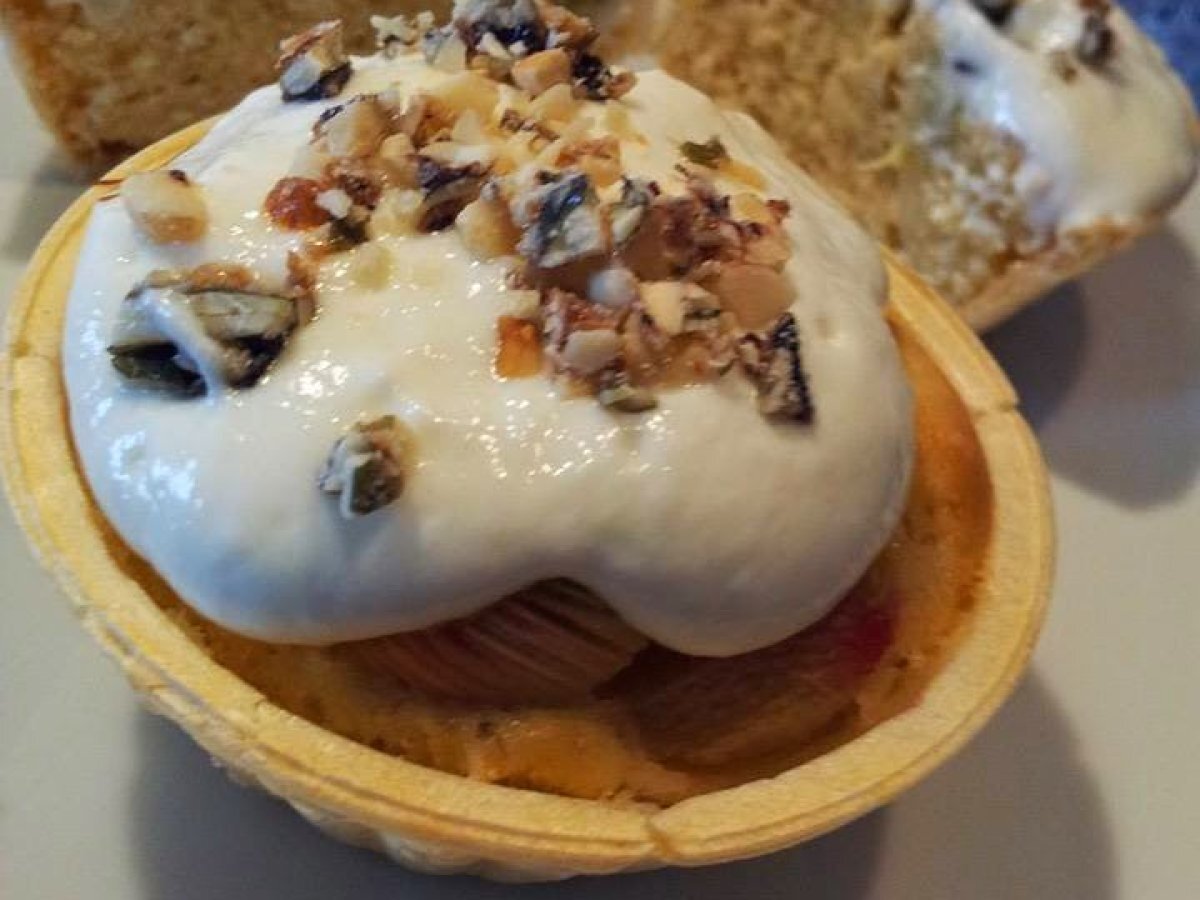 Mehl, Backpulver und Milch dazu geben und zu einem glatten Teig rühren. - Jeweils einen Esslöffel Teig in ein Förmchen geben, Rhabarber darauf verteilen und ca. 20-25 Min. backen.