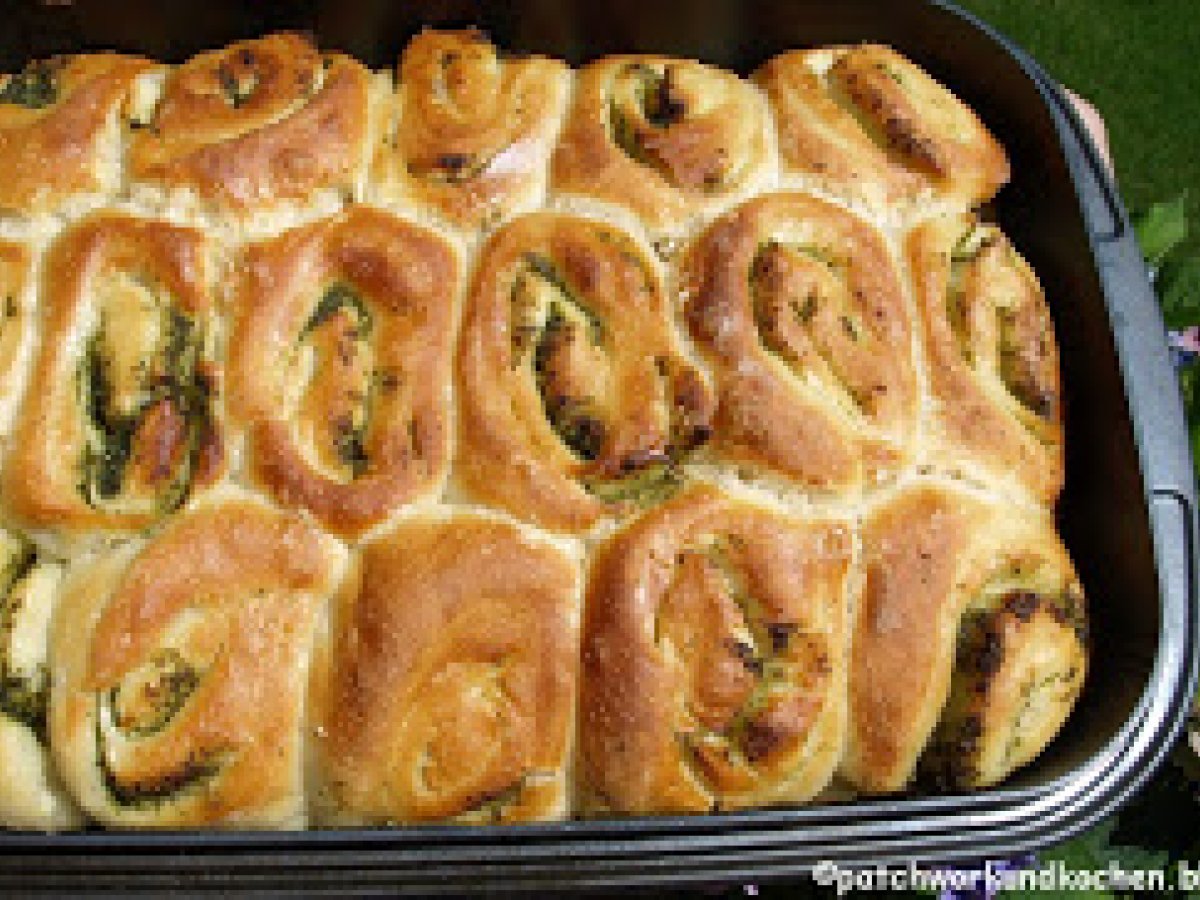 - Den Teig ausrollen bestreichen, mit Kräuterbutter, dicht rollen