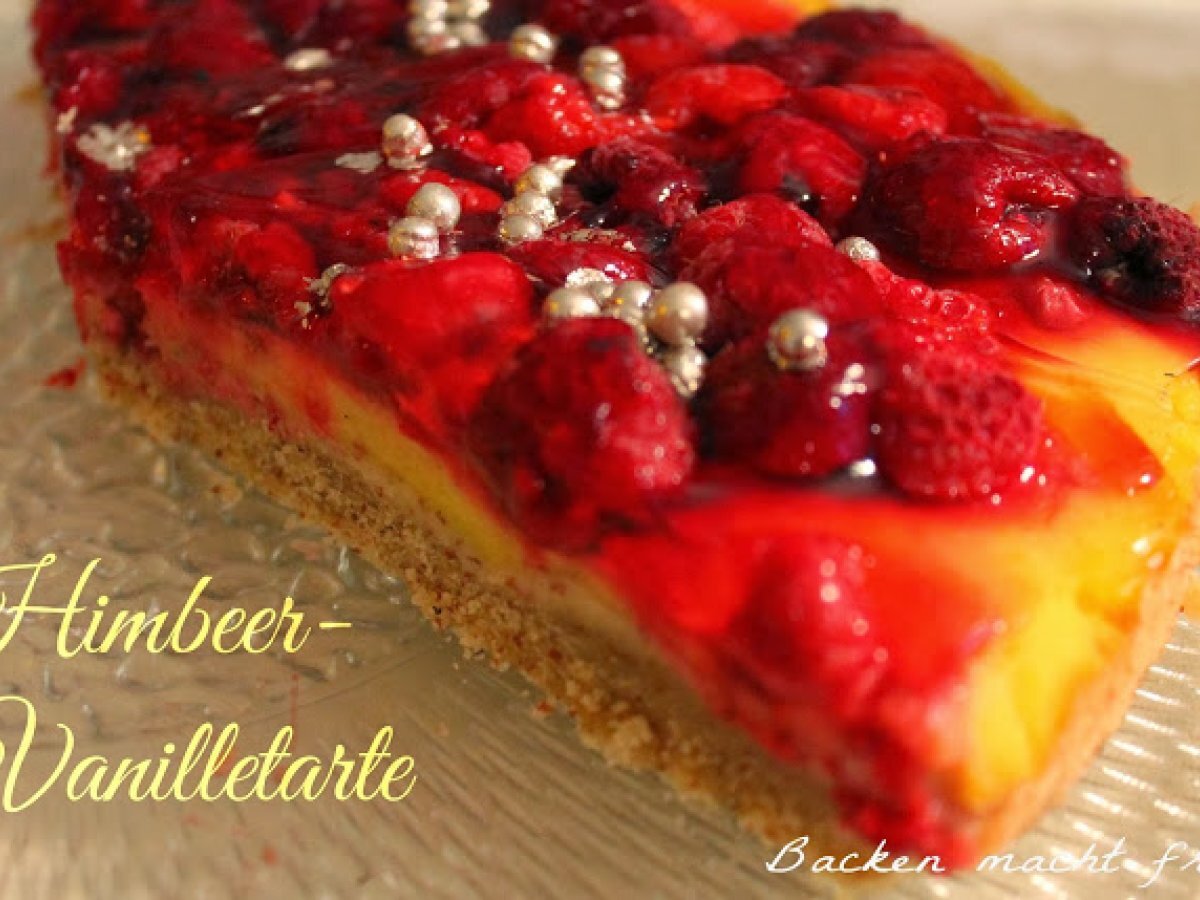 - Creme verdickt sich dann. Löschen Sie vom Ofen und lassen Sie abkülen. Bedecken Sie den Kuchen mit Himbeeren und gießen Sie die Glasur