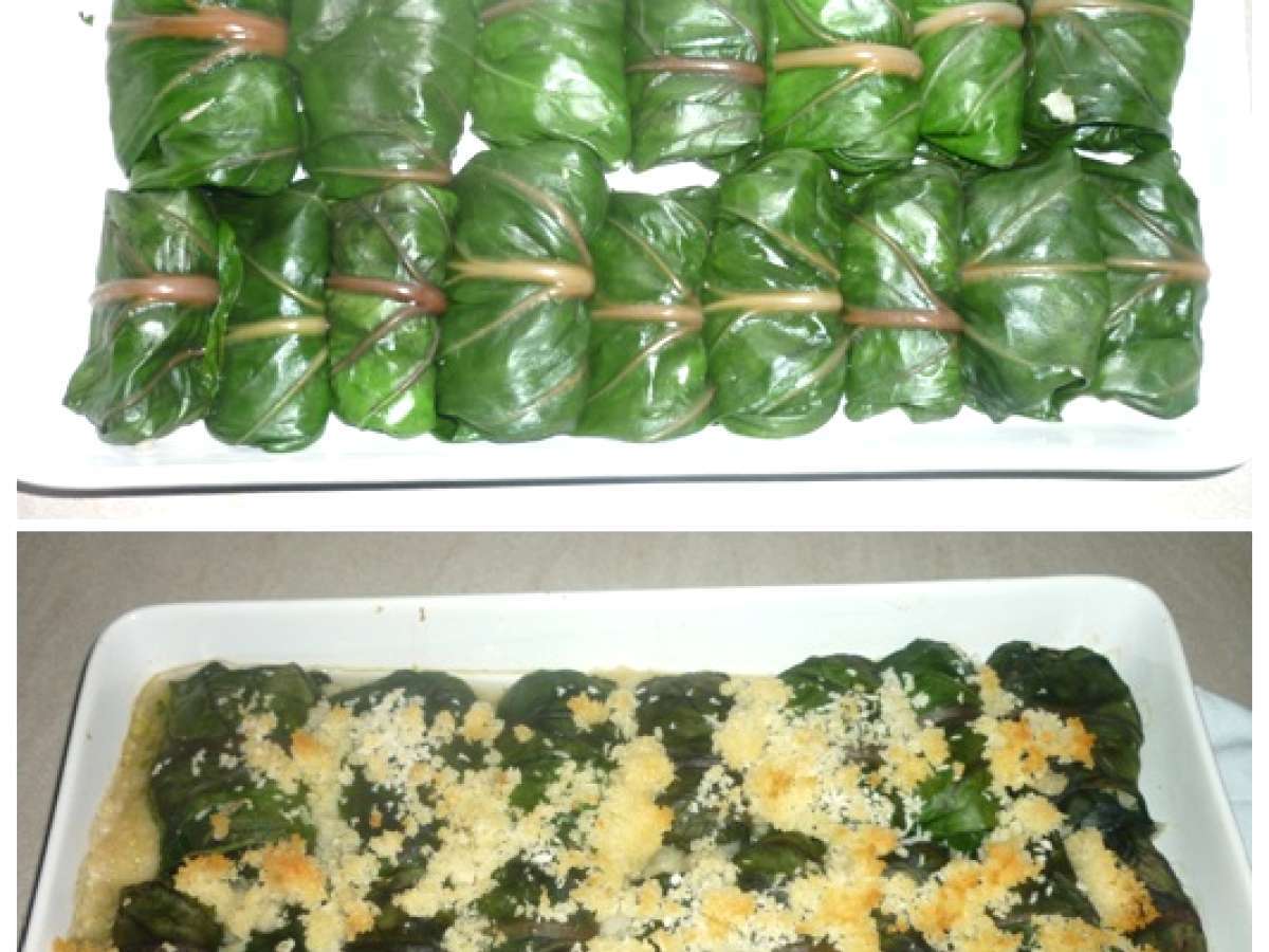- Die blanchierten Mangoldblätter trockentupfen und je einen Löffel Füllung in ein Mangoldblatt einwickeln. Die so vorbereiteten Wickel in eine Auflaufform geben und mit 150 ml heißer Gemüsebrühe übergießen. Im vorgeheiztem Ofen bei 180° ca. 1o Minuten garen.