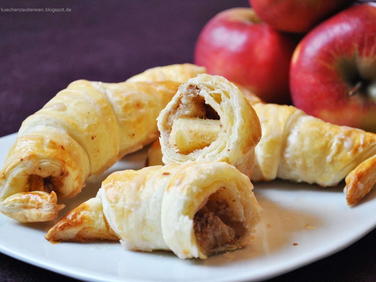 - Auf jedes Dreieck etwa einen gut gehäuften Esslöffel der Apfelmasse geben und zu einem Hörnchen aufrollen. Vorsichtig sein, sonst fällt die Füllung wieder heraus.
