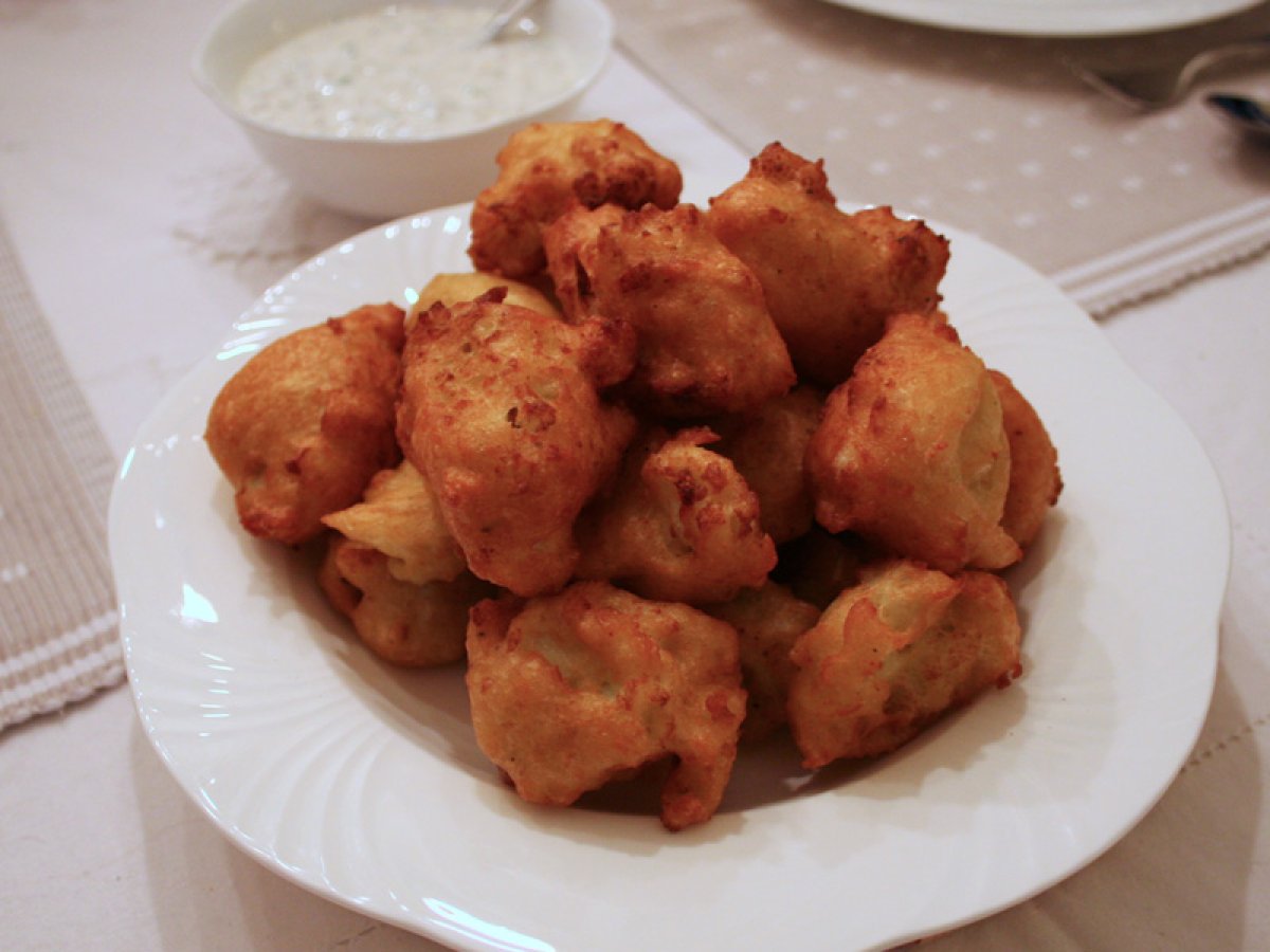 - Öl in einer Pfanne oder Fritteuse auf 165 ° C Hitze. Die Trennung mit 2 EL Öl allmählich Knödel eingetaucht.