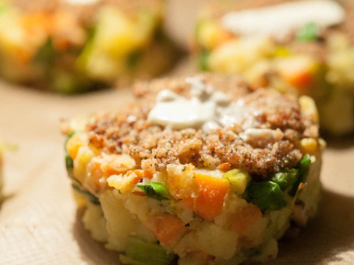 - Auf Portion unterstützen gelegen jene in den Tranchen, die genau auf der Kartoffel- und Gemüsemischung installieren.