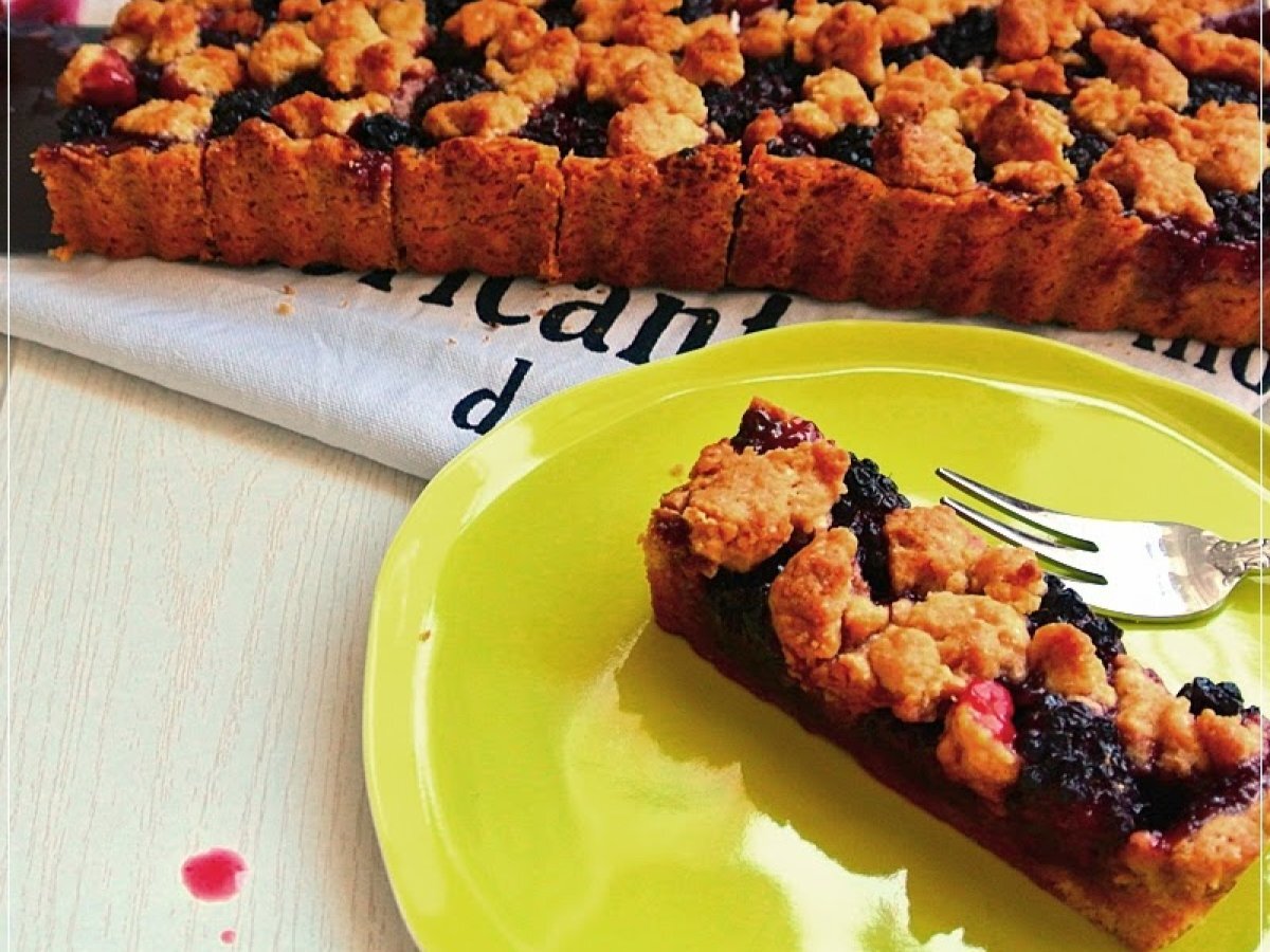 - Die übrigen Streusel über den Beeren verteilen und im vorgeheizten Ofen bei