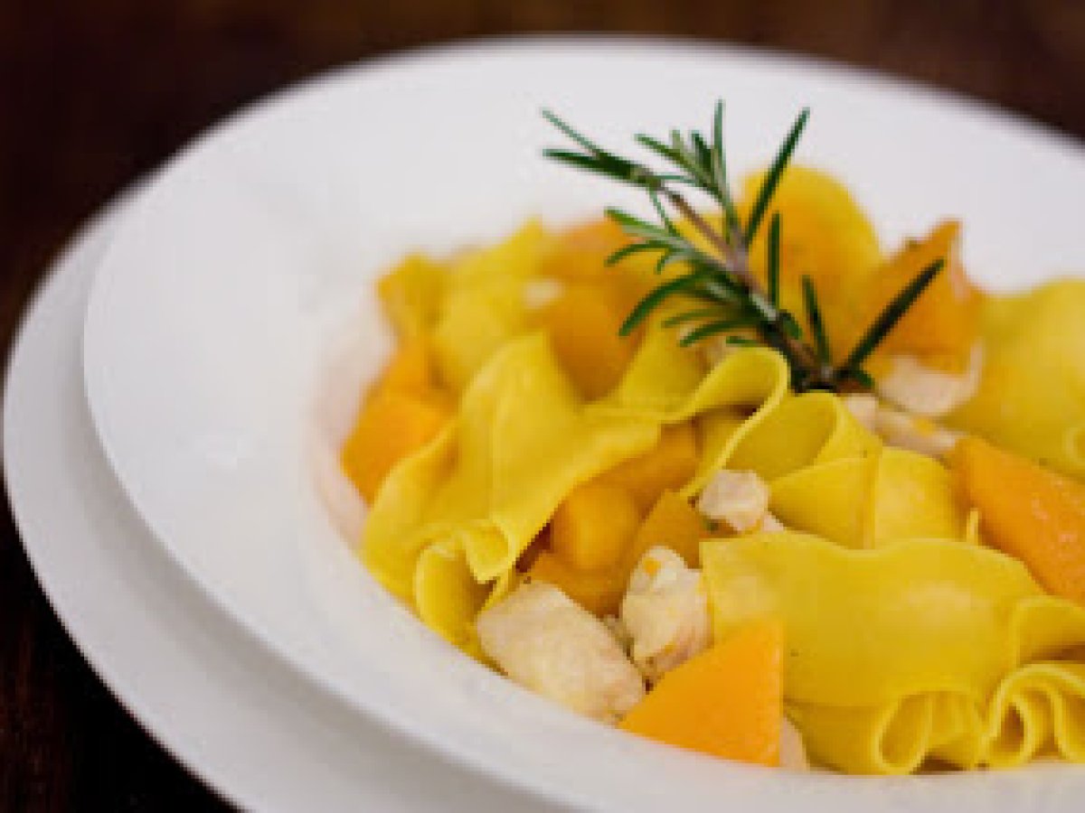 - Fügen Sie den Kürbis, geschält und gewürfelt mit Wein und Hühnerbrühe für das Huhn alle 20 Minuten.