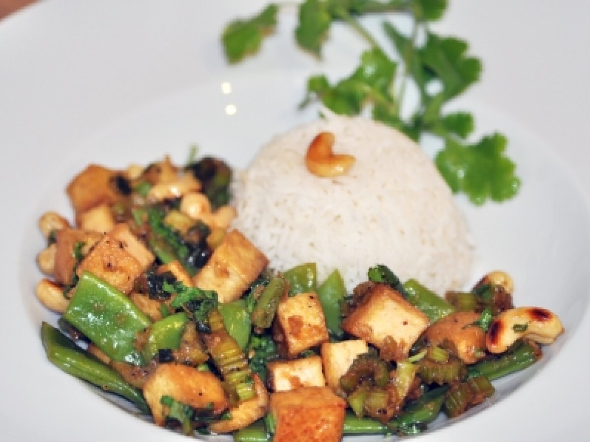 - In der Zwischenzeit, Zwiebeln und saute Sellerie in ein wenig Öl. Setzen Sie den Knoblauch, Ingwer und Chili und braten Sie es in ein wenig weiter. Mit Sojasauce ablöschen, fügen Agavendicksaft, Bohnen, Pfeffer und Zucker.