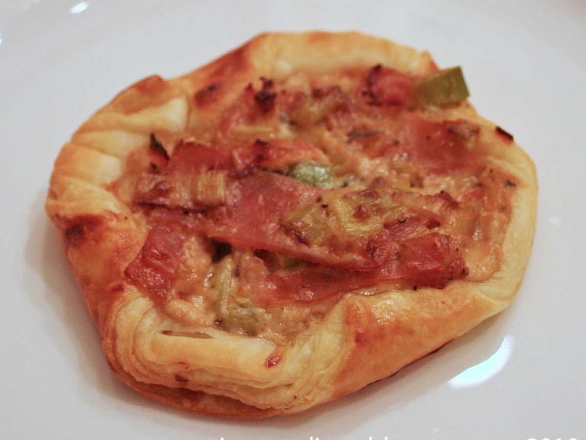 - Dann verteilen Sie den Lauch und Speck-Mischung auf die Mitte der Teiglinge.