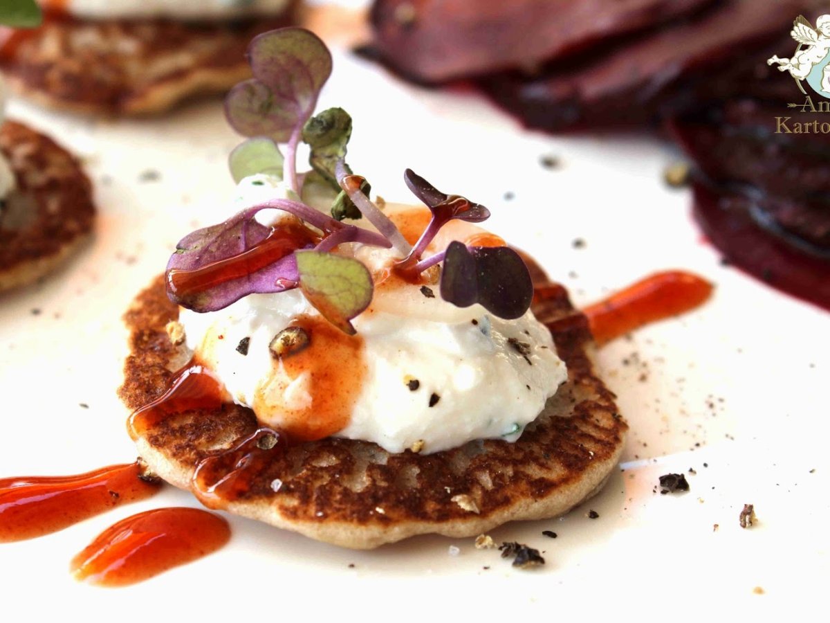 - In einer Pfanne kleine Blini-Pfannkuchen ausbacken