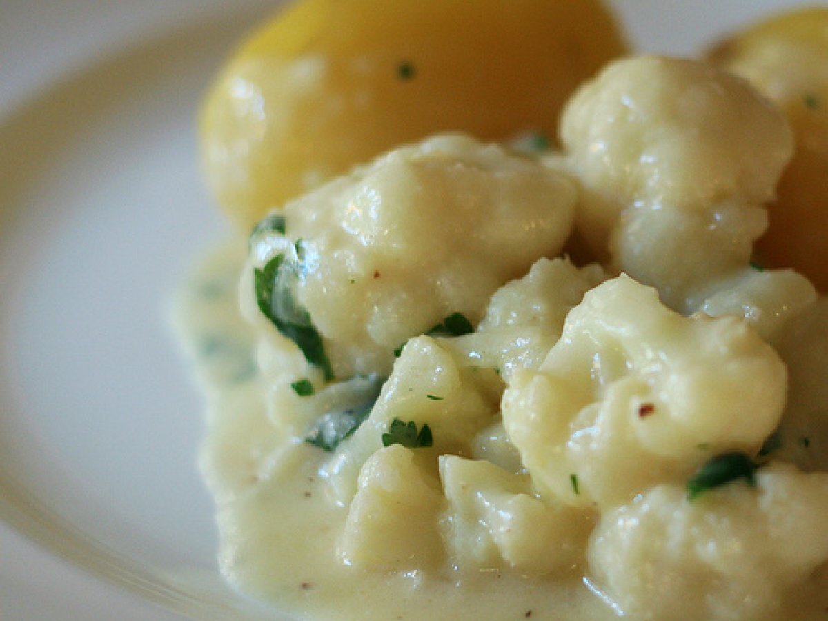 - Den Blumenkohl waschen, abtropfen lassen und die einzelnen Röschen herausschneiden. Schalotten schälen und fein schneiden. In einem Topf mit 2 Esslöffel Butter die Schalotten anschwitzen, mit Mehl bestäuben.