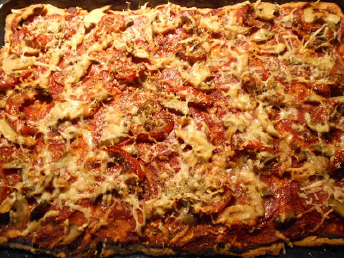 Dinkelpizza mit salami, champignons & confierten tomaten