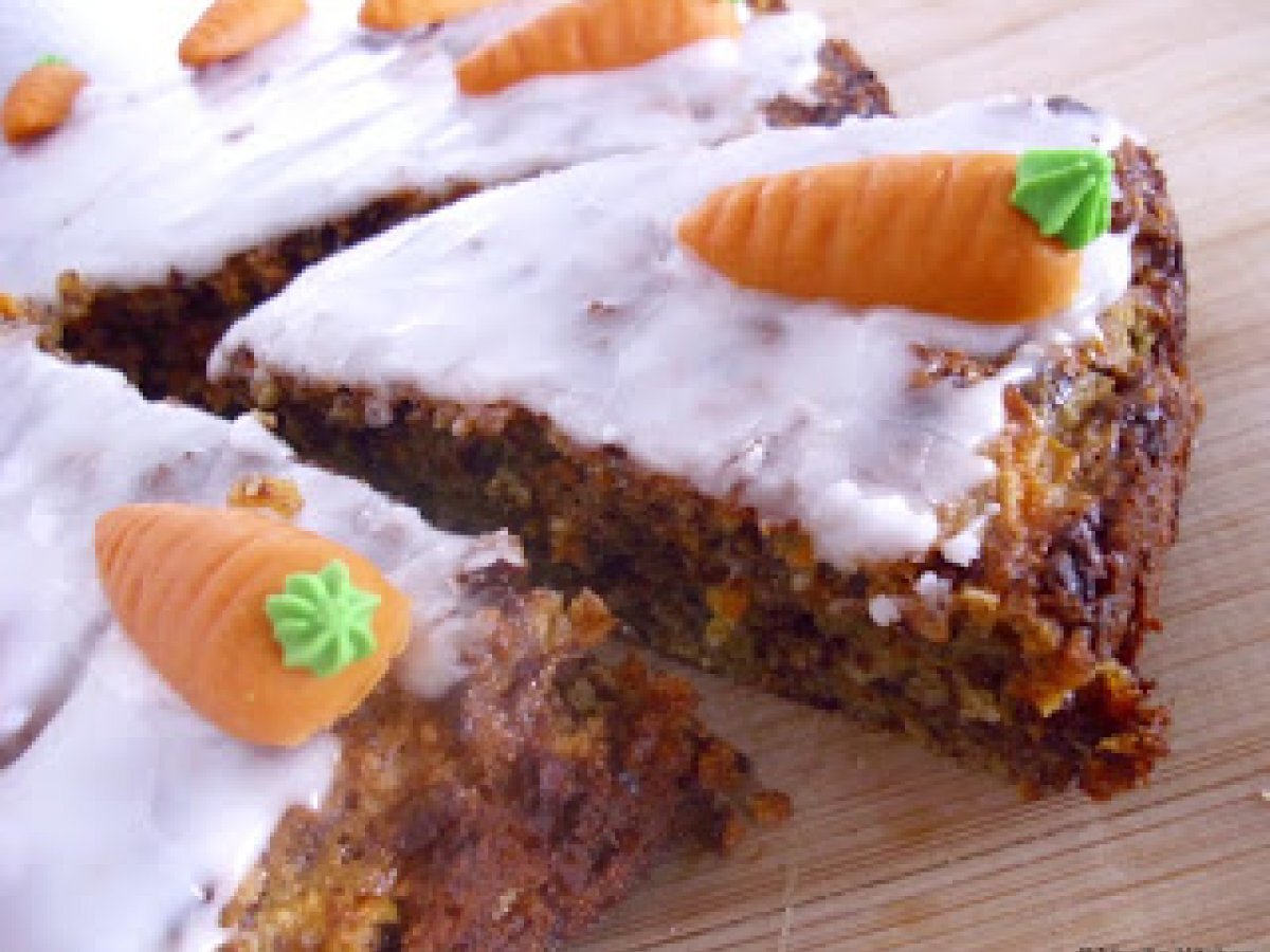 - Marzipan Karotten sofort auf dem Kuchen setzen.
