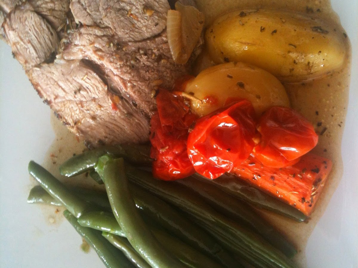 - In den Bräter setzen, ab und zu mit dem Fond beschöpfen. Dann das Fleisch in Alufoliegewickelt 10 Min. ruhen lassen. Mit dem Gemüse aus dem Bräter und den grünen Bohnen servieren.