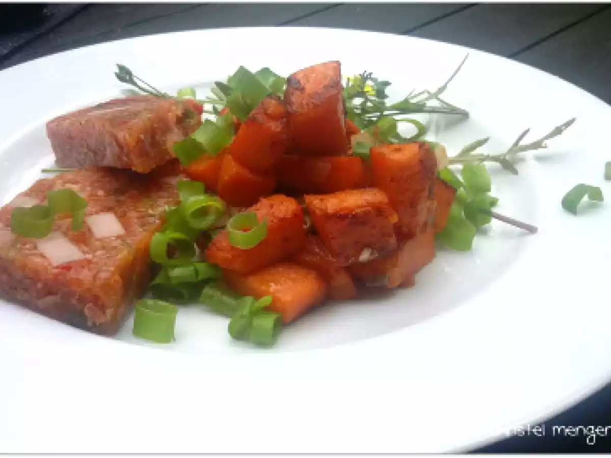 - Die Zwiebelwürfel zugeben und mit anbraten; dabei die Pfanne regelmäßig schwenken, Butter und Walnussöl zugeben und die Süßkartoffelwürfel glasieren.