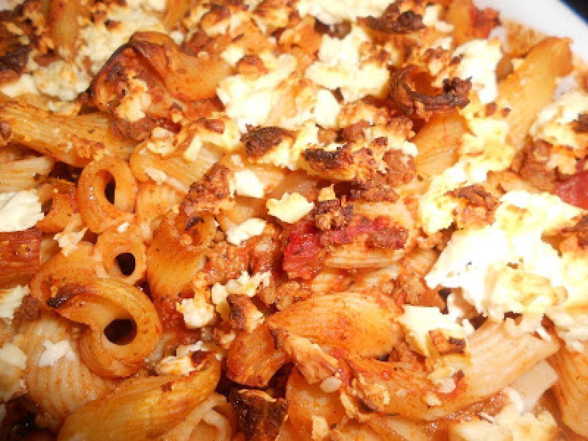 - Alles ging durch in einer Kasserolle. Feta bröckeln und backen Sie für ungefähr 30 Minuten in einem heißen Ofen.