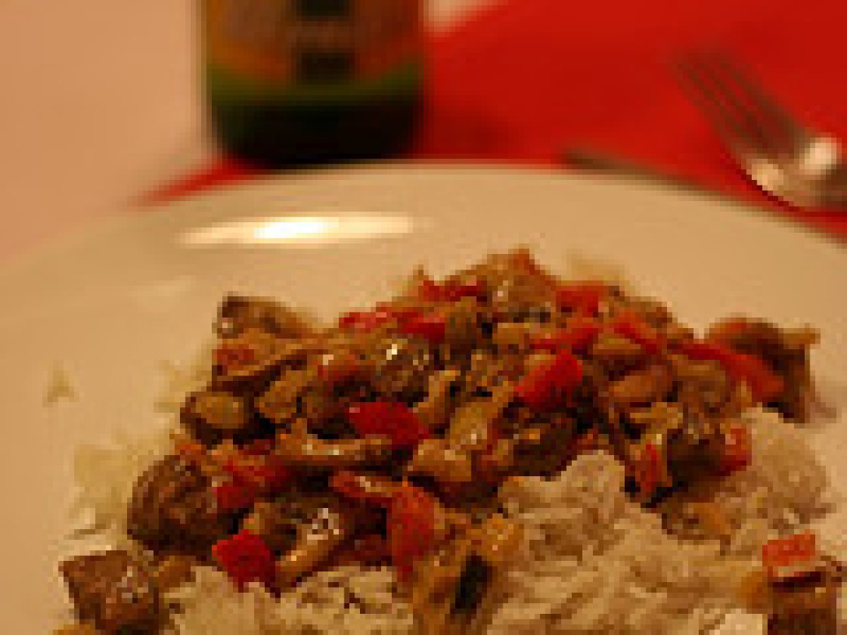 - Schneiden Sie das Fleisch in Würfel schneiden, mit Salz und Pfeffer und braten gut, Paprika, Champignons und Zwiebeln hacken.