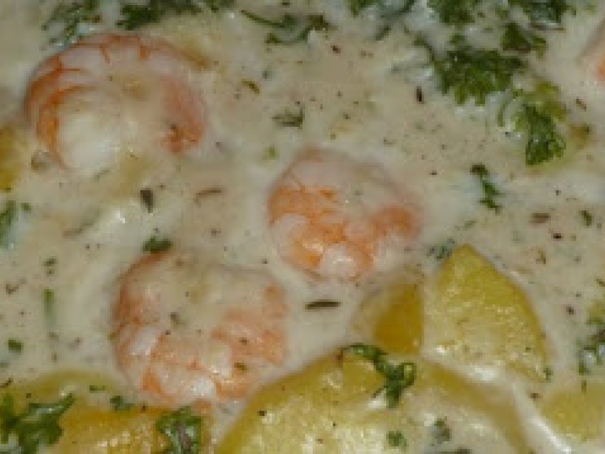 - Ausfetten einen Schmortopf, fügen Sie Zwiebeln Scheiben in Form legenso viel Gemüse Zwiebel nur mit flüssigem sindKartoffel- Rübenscheiben und Schicht auf der Oberseite der Zwiebeln abgedeckt geben die Soße über Garnelen legendie und alles im vorgeheizten Ofen etwa 15 Minuten zu kochen.