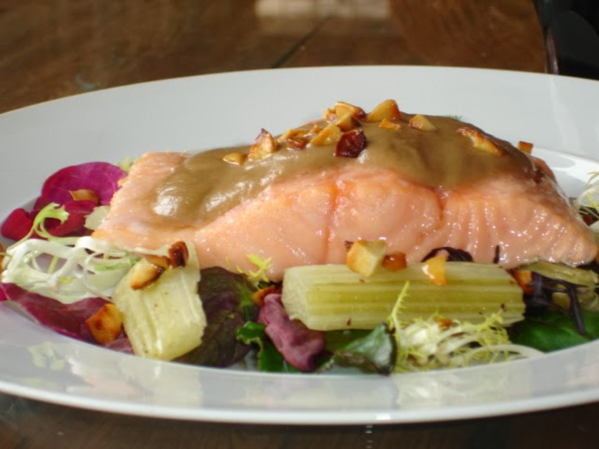 Lachs aus dem backofen mit karden und schwarzbier-apfelsauce