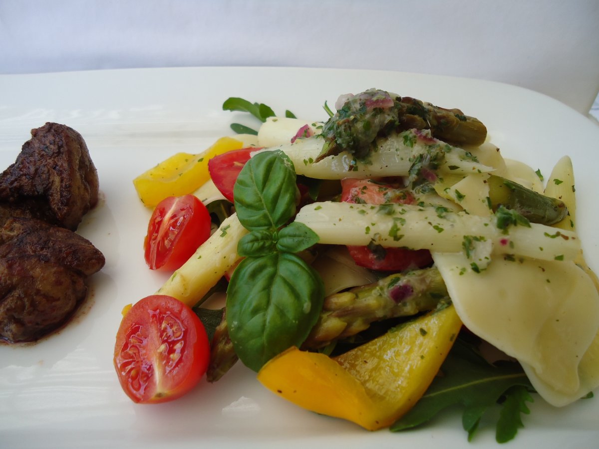 Alle Zutaten für die Vinaigrette verrühren, würzig abschmecken, leicht erwärmen, die Spargelstücke zugeben und gut vermischen. Etwa eine halbe Stunde ziehen lassen.