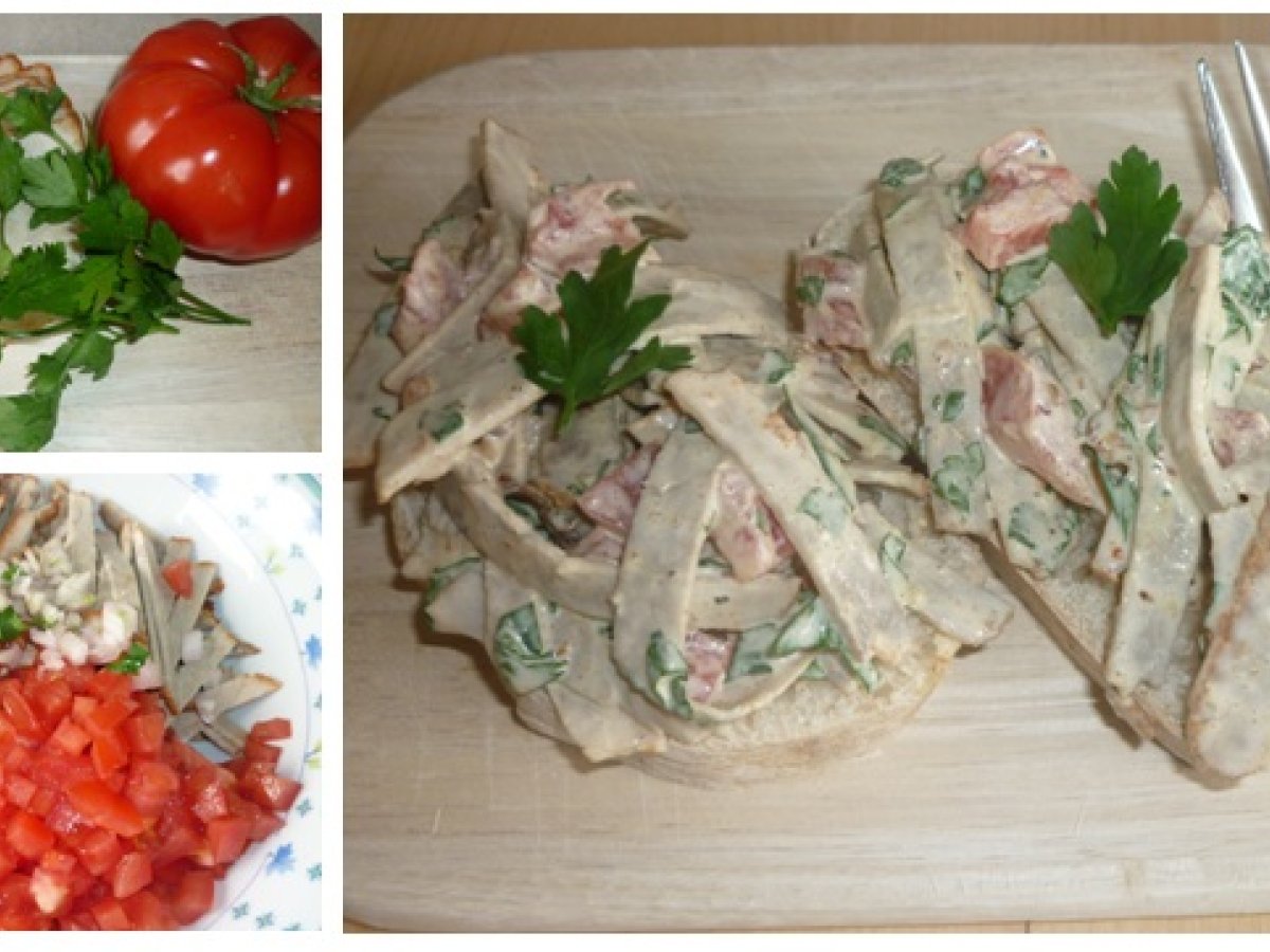 - Das so entstandene Dressing mit den Fleischstreifen, Tomaten- und Schalottenwürfeln vermengen.