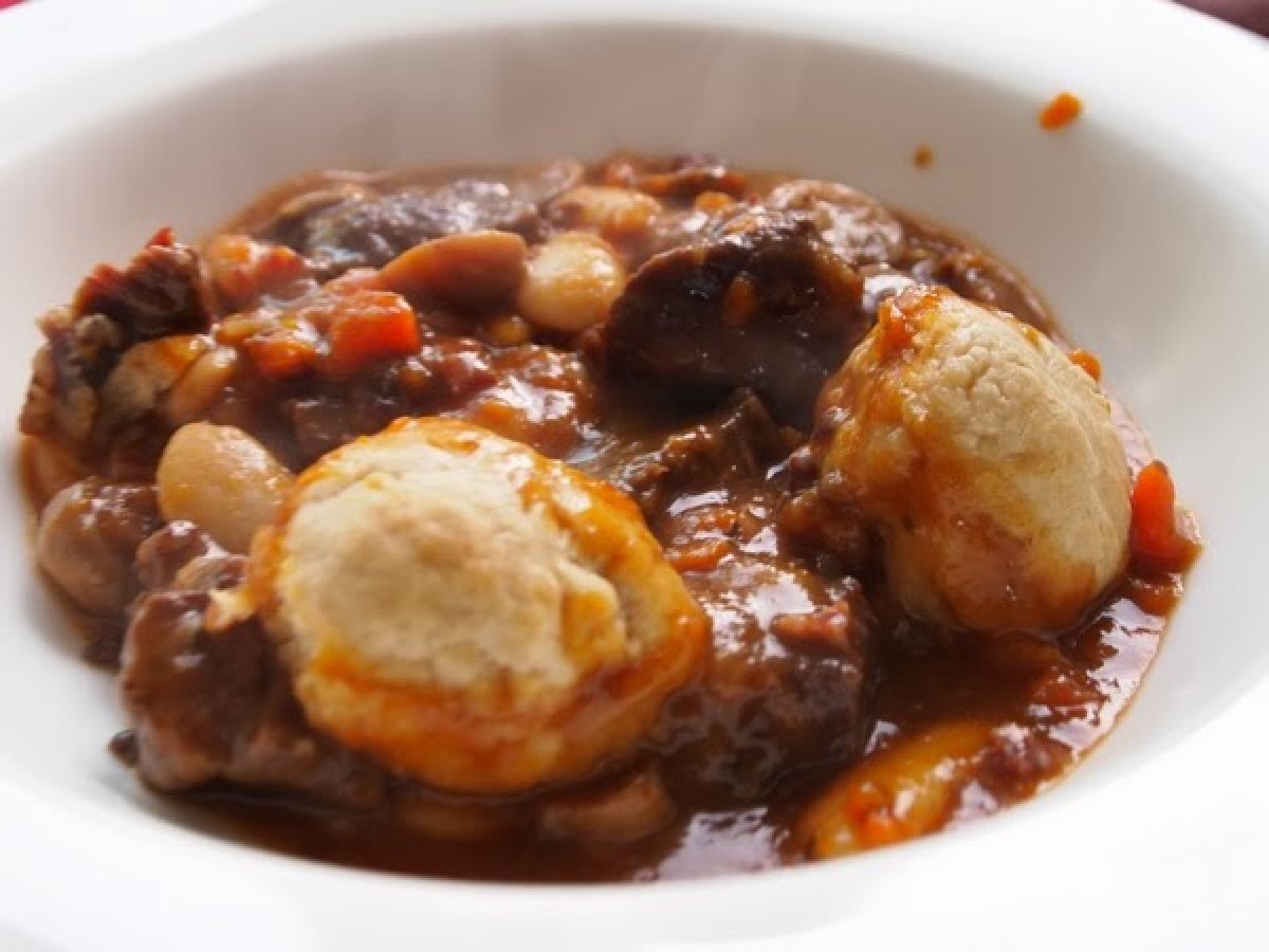 - Eine halbe Stunde vor dem Essen die Klößchen in das heisse Stew setzen, sie sollten halb in der Sauce sitzen. Deckel drauf und im Ofen 20 Minuten garen lassen.