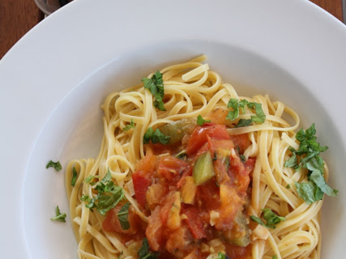 5 gehackte Tomaten, entfernen Sie das Gebräu. Kochen Sie die Pasta. - Das Olivenöl in einer Pfanne und braten Sie den Knoblauch und Zwiebeln darin. Fügen Sie die Tomaten, Saison mit 1 Prise Zucker, ablöschen mit etwas Weißwein und kurz köcheln lassen.