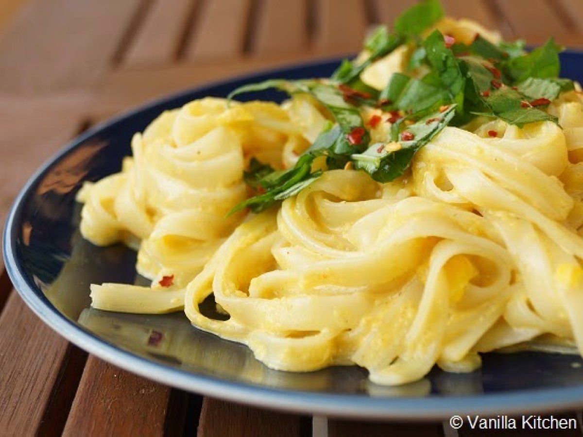 Während dessen die Paprika und Knoblauchzehe in Stücke schneiden, diese zusammen mit der Mandelbutter, Kokosmilch sowie den Gewürzen im Mixer pürieren. - Die Sauce mit den Nudeln vermengen, nochmal mit Salz und Pfeffer abschmecken - mit dem Basilikum und den Chiliflocken garniert servieren.