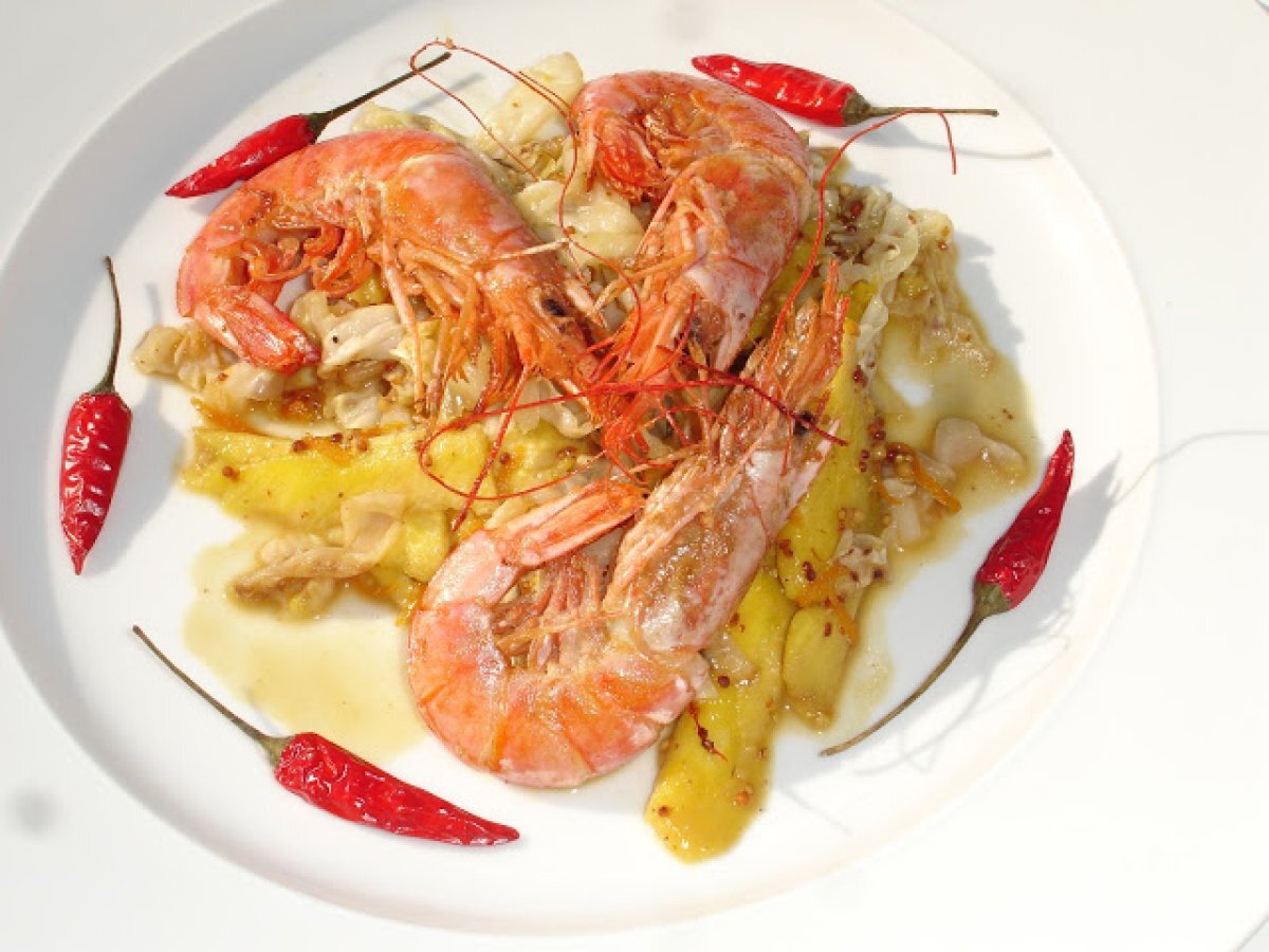 Riesengarnelen mit senf-chilipüree und mangostreifen