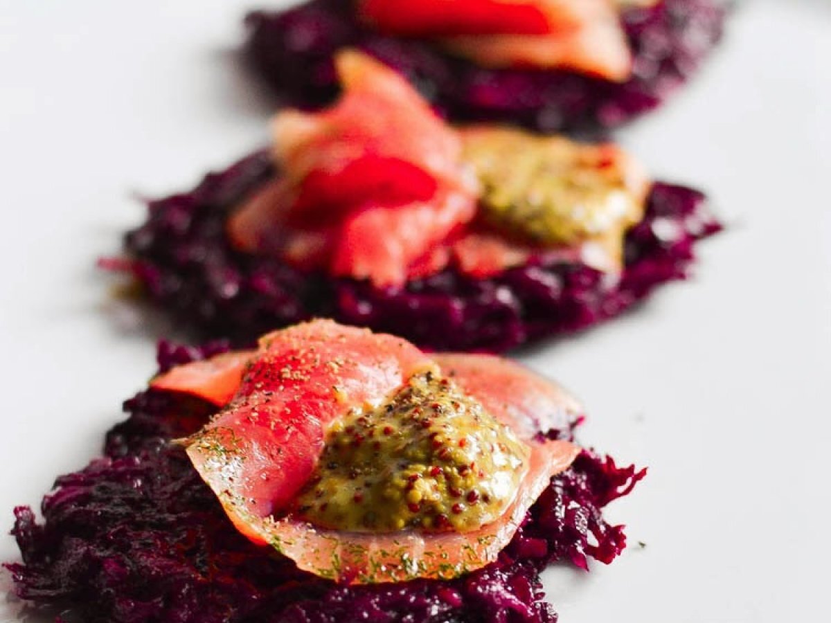 - Von beiden Seiten kross braten und auf einem Küchenkrepp abropfen lassen.Die Puffer wie bei Nigel Slater mit einigen Lachsscheibchen und der Senfsauce anrichten, oder mit etwas Avocadocreme oder Sourcreme.
