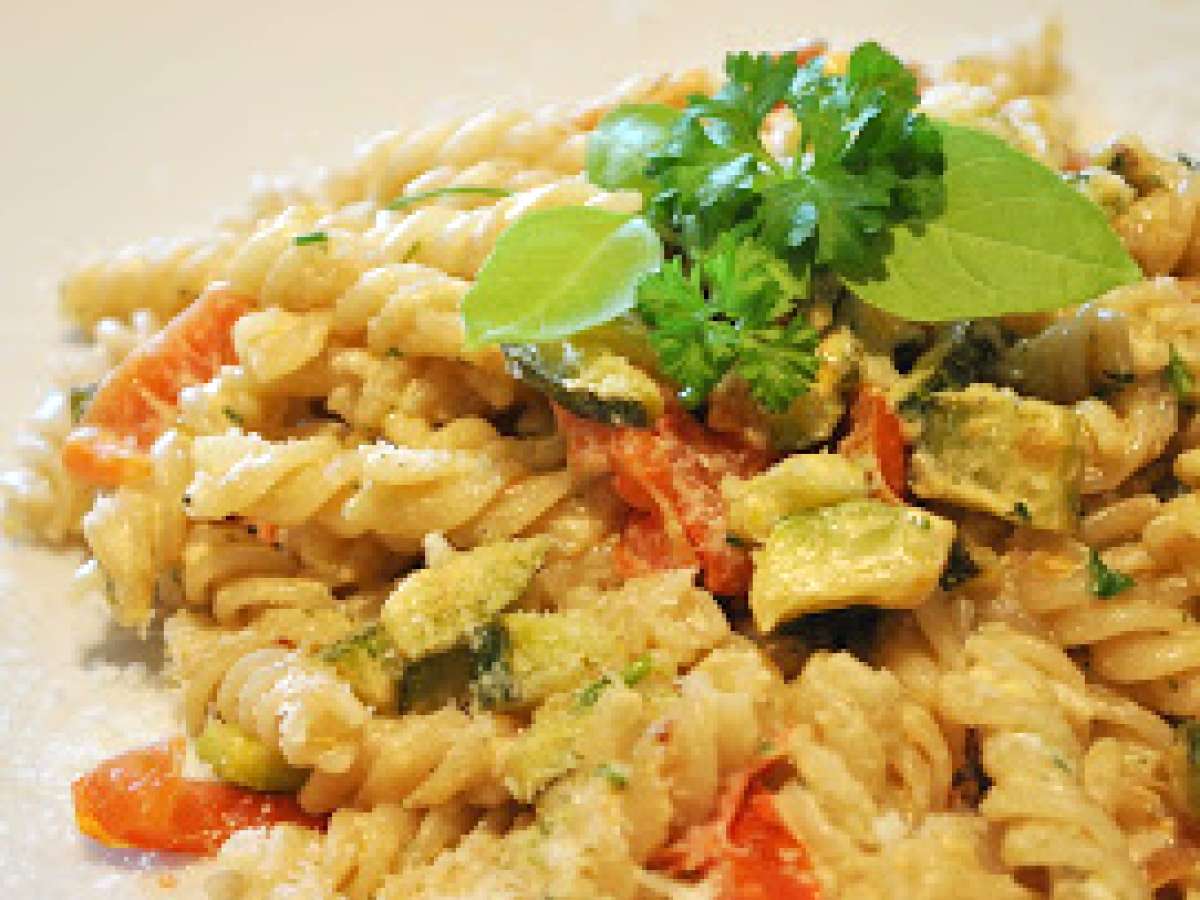 - Währenddessen die Tomaten- und Zucchinistückchen im Olivenöl anbraten, dann den Schmand einrühren. Kräuter und Parmesan unterrühren und mit Salz und Pfeffer abschmecken.