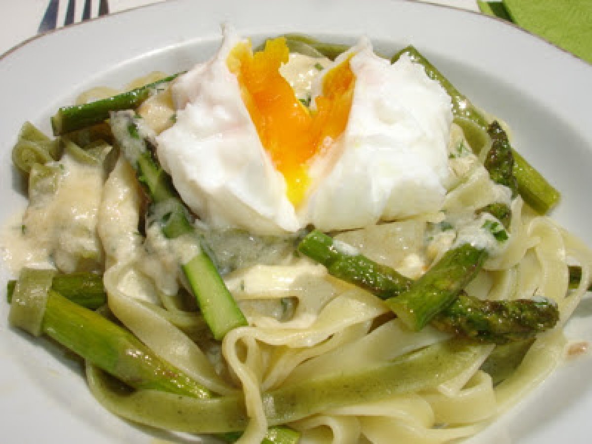 Tagliatelle mit parmesansahnesauce, grünem spargel und pochiertem ei