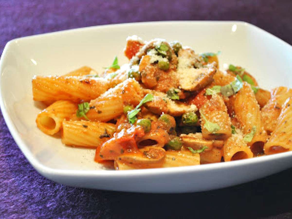 Tortiglioni in cremiger tomatensoße mit champignons & erbsen