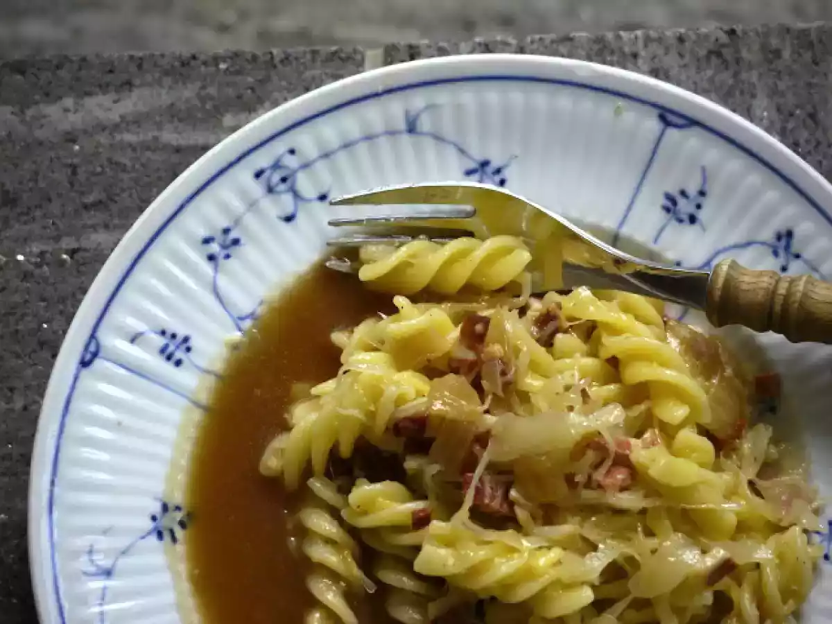 Vegane sauerkraut-speck-käse-nudeln mit bratensoße (v)