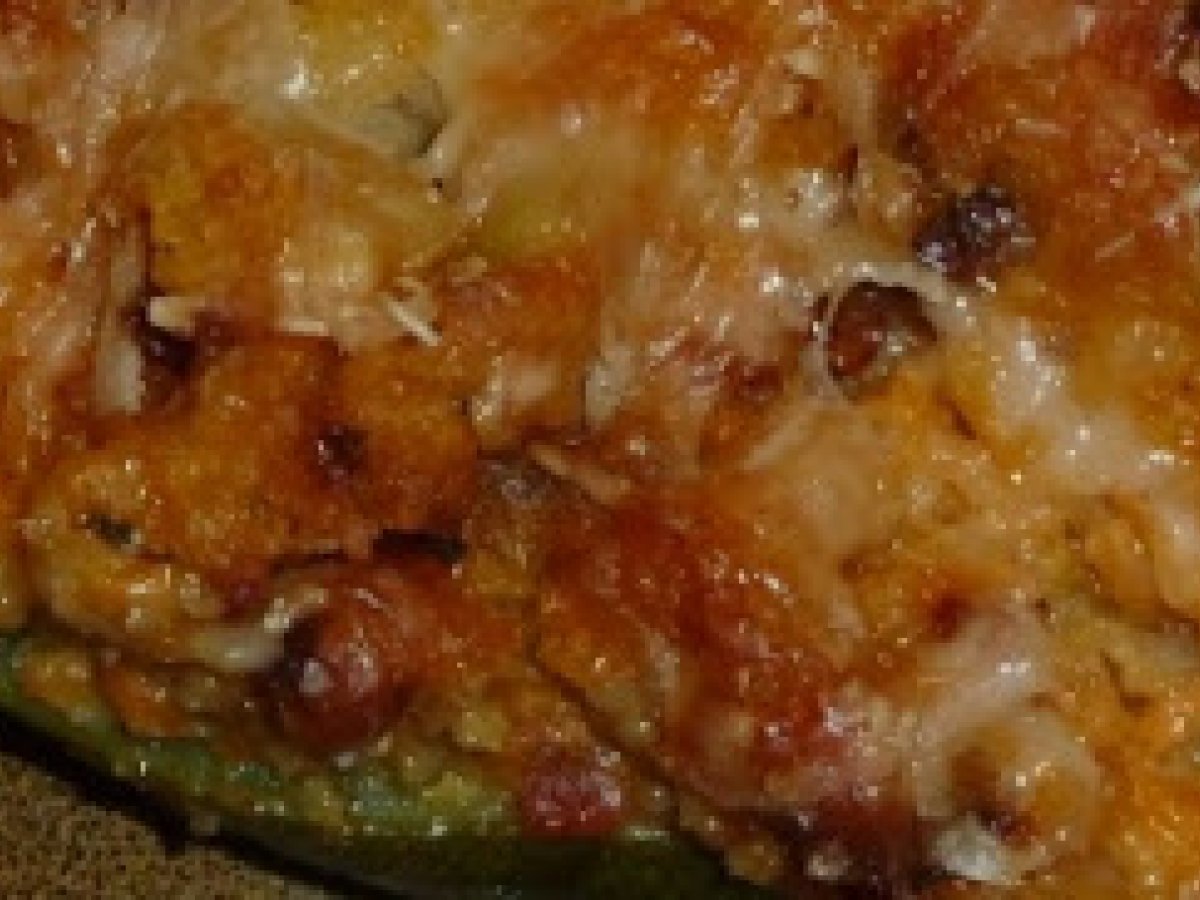 - Legen Zucchinihälften in eine Auflaufform und füllen Sie es mit der vorbereiteten Masse.