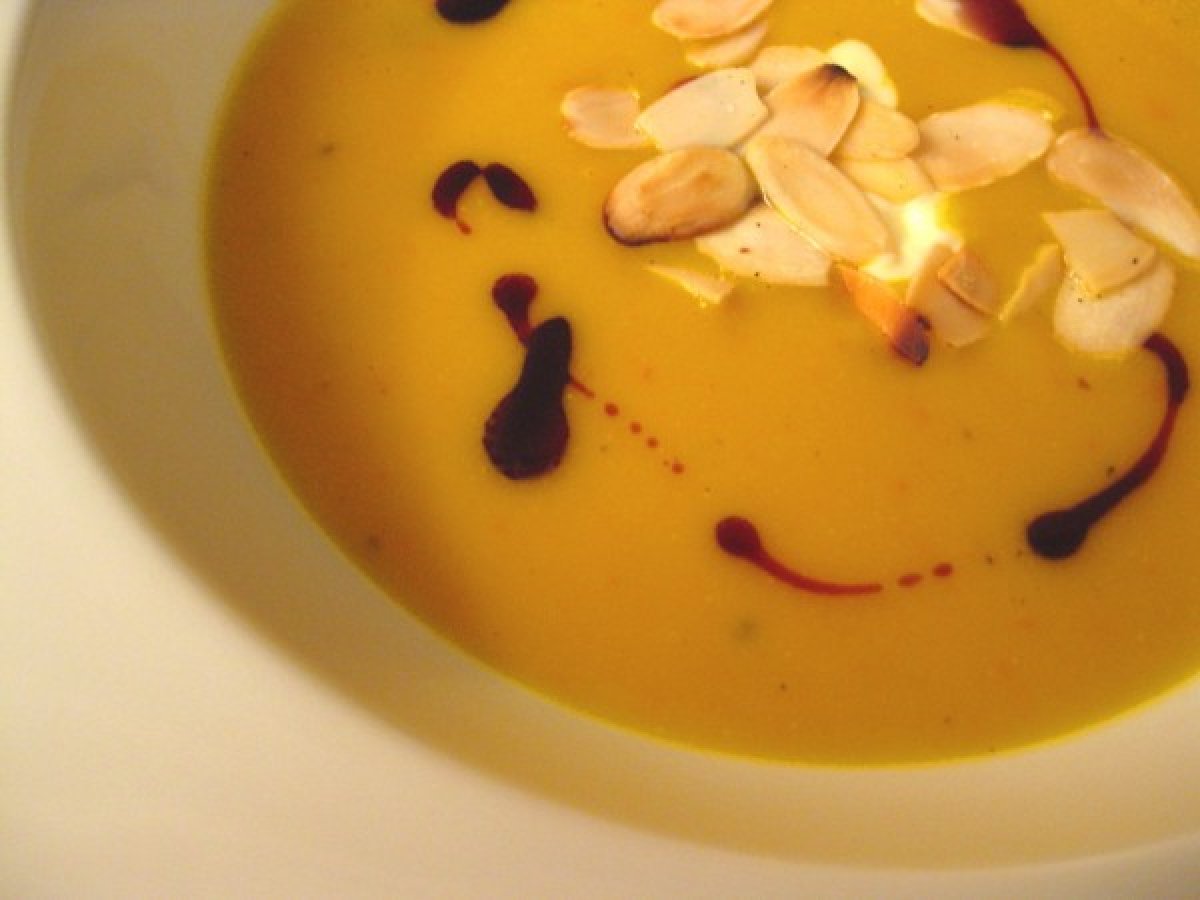 Butter in einem Topf schmelzen die Zwiebel und drei bis fünf Minuten. - Lassen Sie braten bis sie goldbraun sind. Karotten und Kürbis Stücke schneiden und kochen wieder weiter Schwitzen. Kartoffelstücke und Safran.