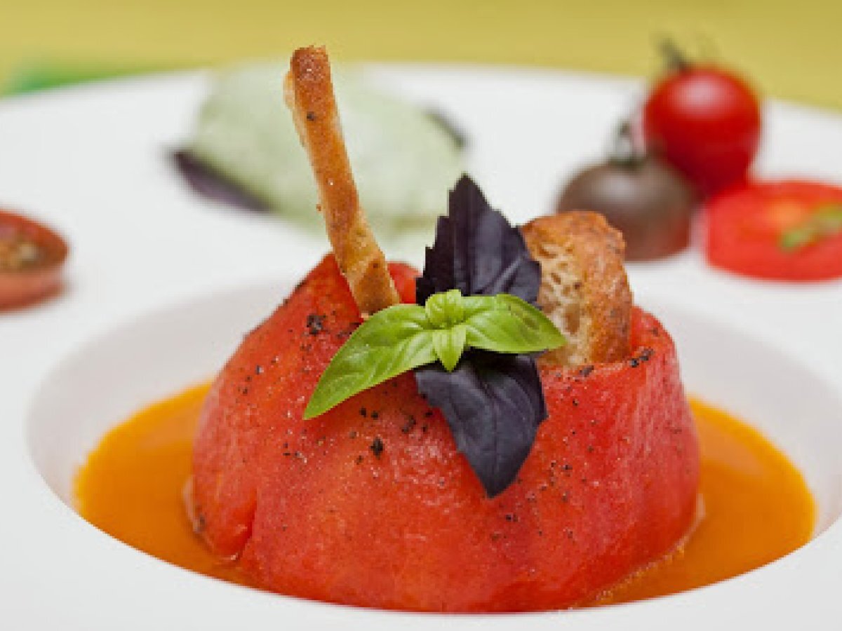 Die letzten tomaten des sommers: ofentomate mit tomatensuppe und basilikumsorbet