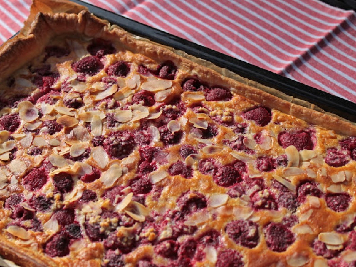 - Gießen Sie die Sauce über die geschnittenen Mandeln und Himbeeren auf der Oberseite der Ausbreitung.