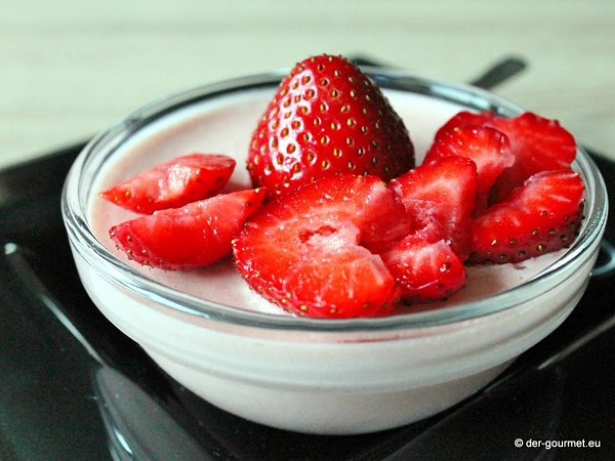 - Die Erdbeeren abbrausen und putzen. 200g der Erdbeeren mit Erdbeersirup fein pürieren und durch ein feines Sieb streichen.
