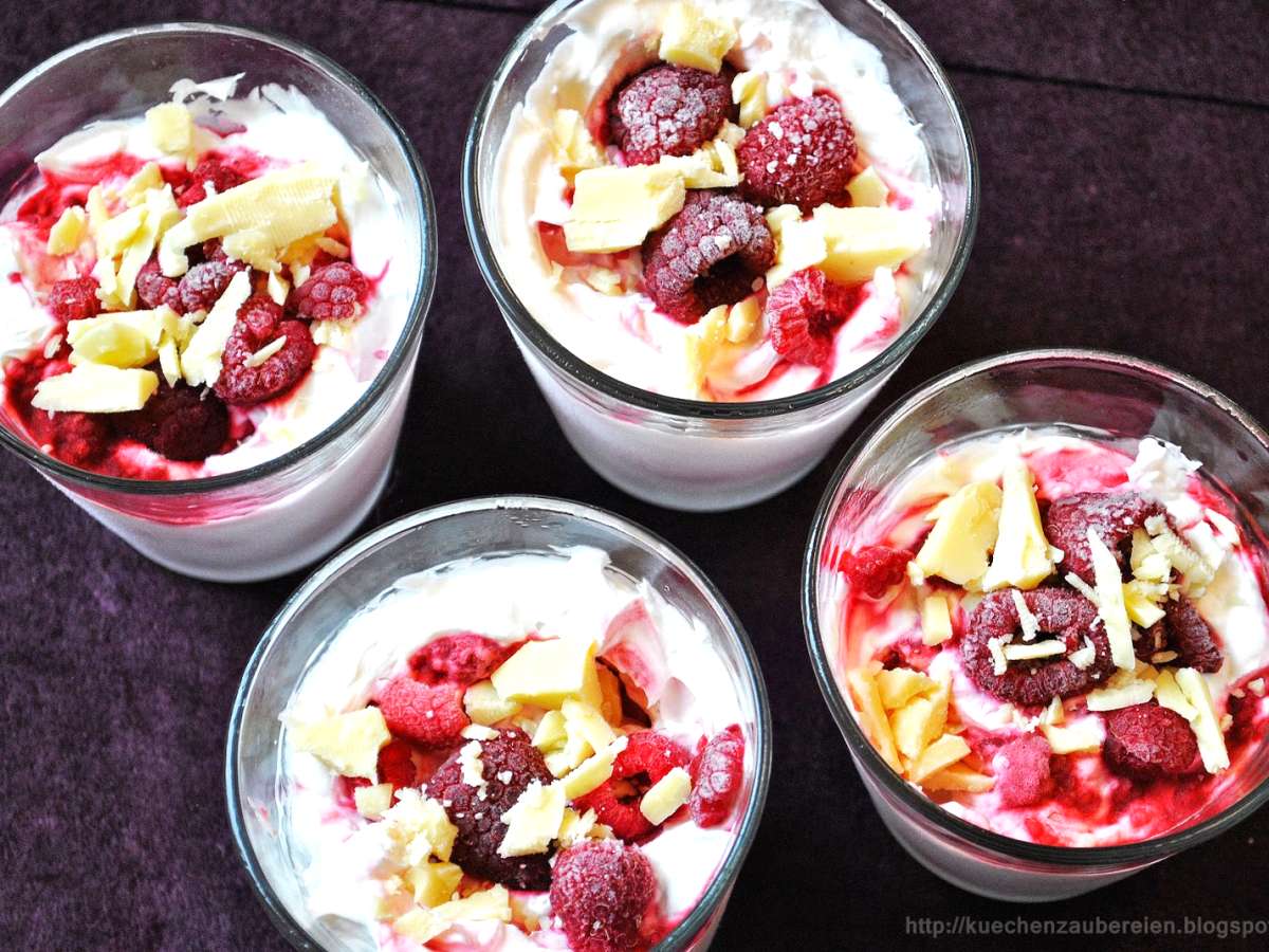 - Die Hälfte der Himbeeren auftauen und mit einer Gabel zerdrücken, sodass man ein grobes Fruchtpüree hat. Die weiße Schokolade grob hacken.