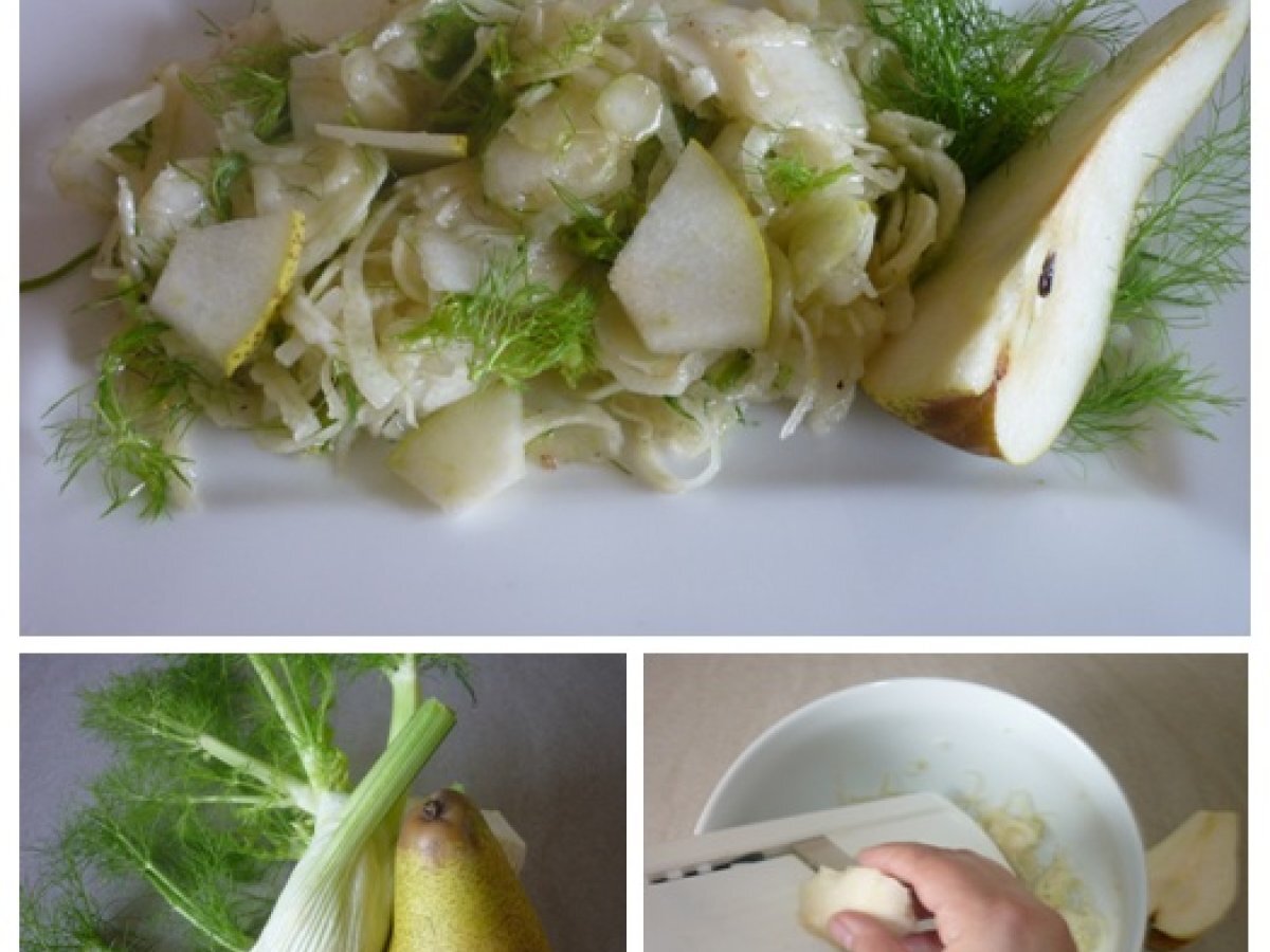 - Die Birnen schälen, vierteln und ebenfalls fein hobeln. Birnen mit Fenchel vermischen und mit Essig, den beiden Ölen, Salz und Pfeffer anmachen.
