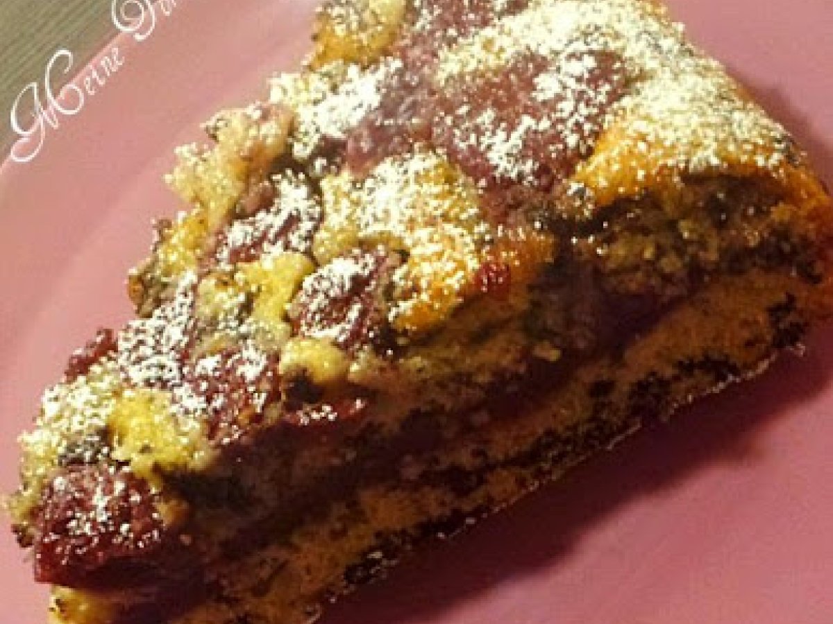 - Der Kuchen, die ich seit der Mitte halbiert. Die obere Hälfte verkehrtrum in der Backform entfernt.