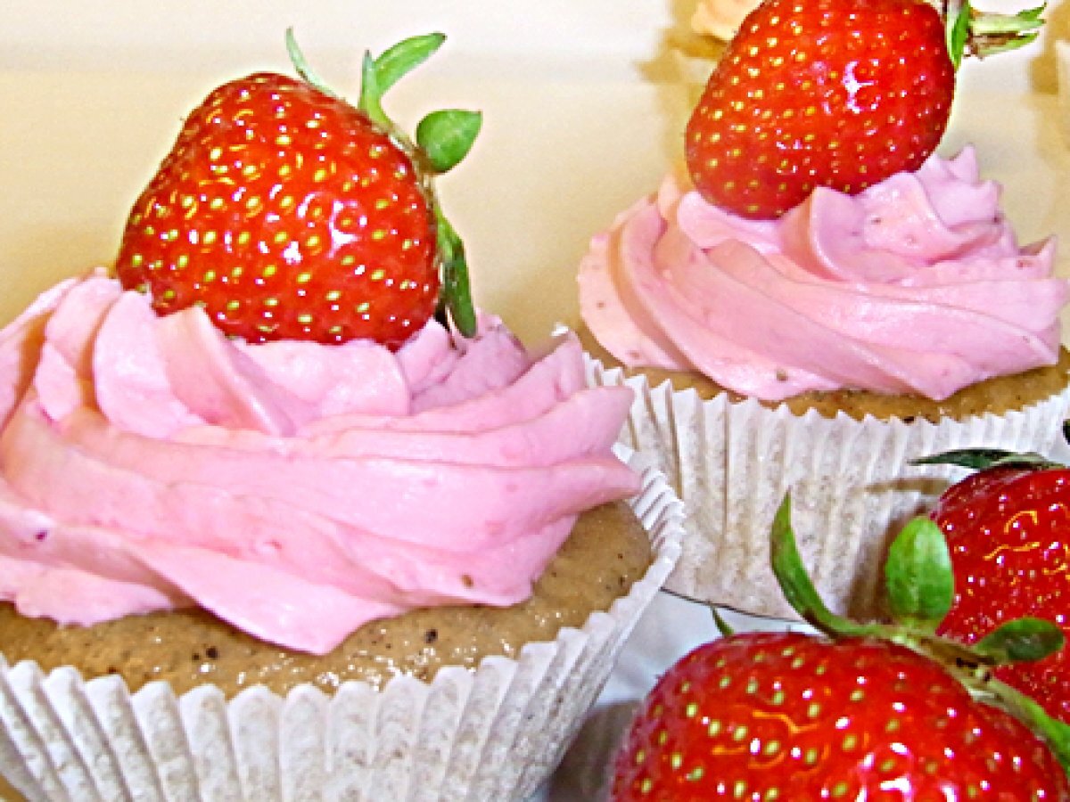 Vanille-buttermilch cupcake mit erdbeer-topping