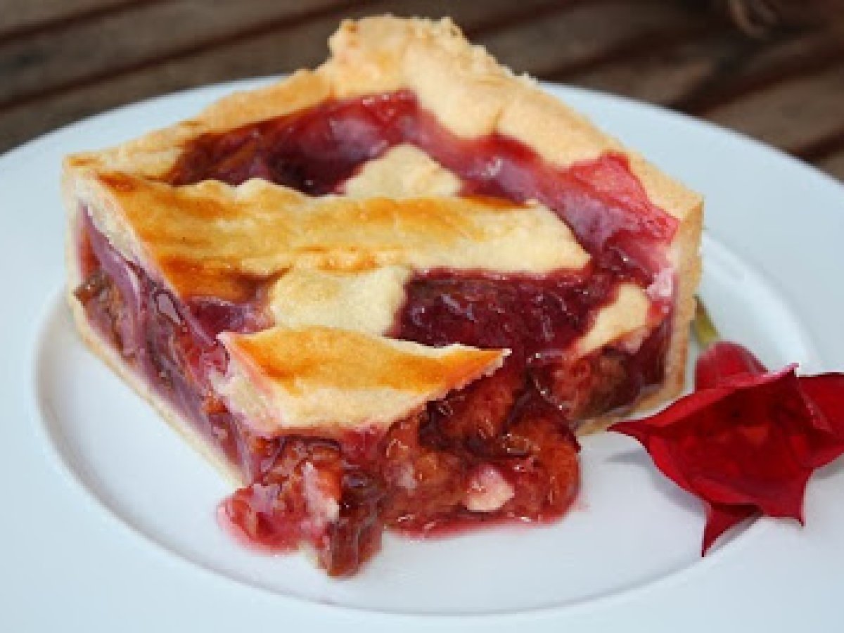 - Den übrigen Teig ausrollen und in Streifen schneiden und als Gitter auf die Früchte legen. Ei und Milch verrühren, Gitter damit bepinseln.