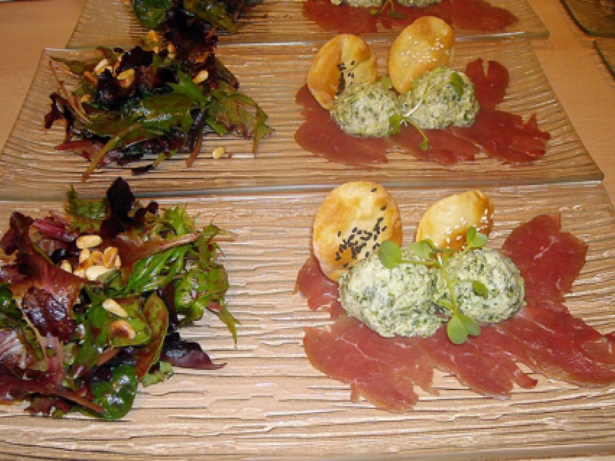 Setzen Sie alles in einem Schraubglas und kräftig schütteln. - Entenschinken mit Rucola-Salat und Schaum.