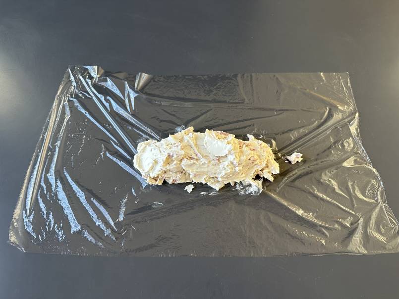 Breiten Sie ein Stück Frischhaltefolie auf dem Tisch aus. Anschließend die Mischung in die Mitte legen.